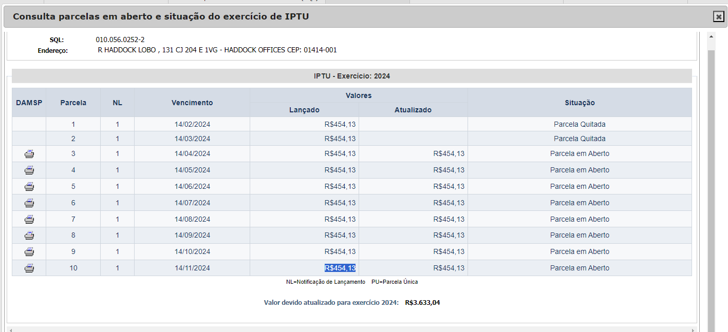 Valor mensal de IPTU: R$ 454,13 (para exercício de 2024).